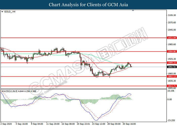GOLD_, H4: Gold price was traded lower following prior retracement from the resistance level at 1909.35. MACD which illustrated diminishing bullish momentum suggest the pair to extend its losses toward support level at 1852.15.