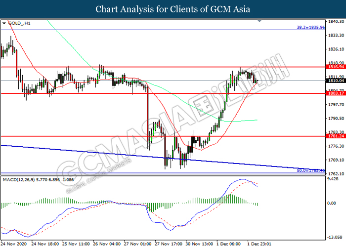 GOLD_, H1: Gold price was traded lower following prior retracement from the resistance level at 1816.95. MACD which illustrated increasing bearish momentum suggest the commodity to extend its losses toward support level at 1803.15.