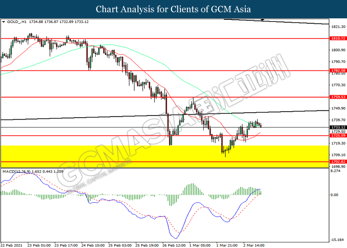 GOLD_, H4: Gold price was traded higher following prior breakout above the previous resistance level at 1725.60. However, MACD which illustrated diminishing bullish momentum suggest the commodity to be traded lower in short-term as technical correction.