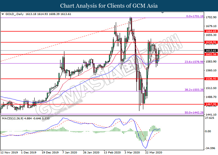 GOLD_, Daily: Gold price was traded higher following prior breakout above the previous resistance level at 1602.55. MACD which illustrate bullish bias momentum suggest the commodity to extend its gains toward the resistance level at 1634.90.