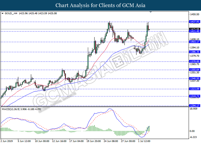 GOLD_, H4: Gold price was traded higher following prior breakout above the previous resistance level 1421.40. MACD which illustrate bullish bias signal with the formation of golden cross suggest the commodity to extend its gains towards the resistance level 1437.95.