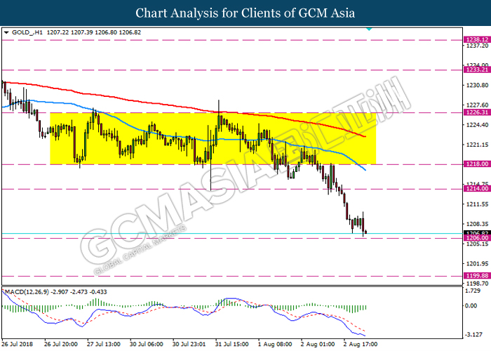GOLD_, H1: Gold price was traded lower following recent breakout below the support level 1214.00 and currently testing the support level 1206.00. Although MACD which illustrate ongoing bearish momentum, a breakout below the support level 1206.00 is required for further confirmation.