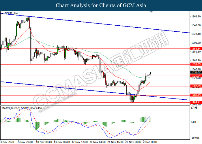GOLD_, H4: Gold price was traded breakout above the previous resistance level at 1826.25. However, MACD which illustrated diminishing bullish momentum suggest the commodity to be traded lower in short-term as technical correction.