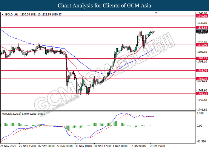 GOLD_, H1: Gold price was traded higher following prior rebound from the support level at 1816.00. Due to lack of signal from MACD, it is suggested to wait for further confirmation before entering into the market.
