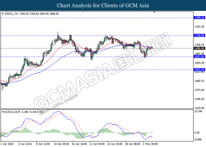 GOLD_, H4: Gold price was traded higher following recent rebound from the support level 1672.90. MACD which illustrate bullish momentum signal with the formation of golden cross suggest the commodity to extend its rebound towards the resistance level 1736.00.