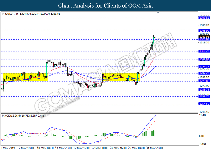 GOLD_, H4: Gold price was traded higher following prior breakout above previous resistance level 1323.10. However, MACD which illustrate diminishing bullish momentum signal suggest the commodity to be traded lower as a short term technical correction towards the support level 1323.10.