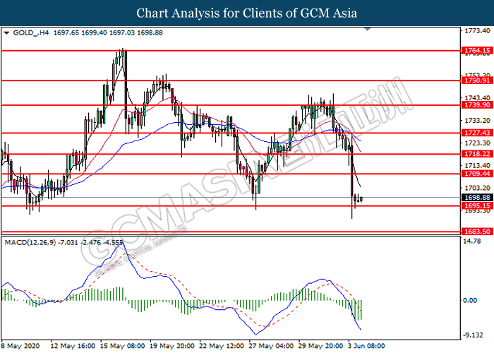 GOLD_, H4: Gold price was traded higher following prior rebound from the support level at 1695.15. MACD which illustrate diminishing bearish momentum signal suggest the commodity to extend its rebound toward the resistance level at 1709.45.