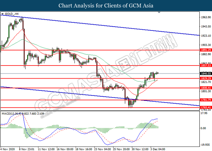GOLD_, H4: Gold price was traded higher following prior rebound from the support level at 1829.30. MACD which illustrated diminishing bullish momentum suggest the pair to be traded lower in short-term as technical correction.