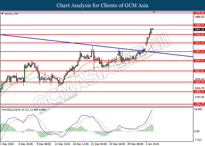 GOLD_, H4: Gold price was traded higher following prior breakout above the previous resistance level at 1930.55. However, MACD which illustrated diminishing bullish momentum suggest the commodity to be traded lower in short-term as technical correction.