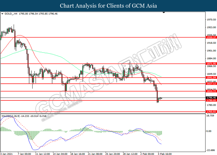 GOLD_, H4: Gold price was traded lower while currently testing the support level at 1790.05. However, MACD which illustrated diminishing bearish momentum suggest the commodity to be traded higher in short-term as technical correction.