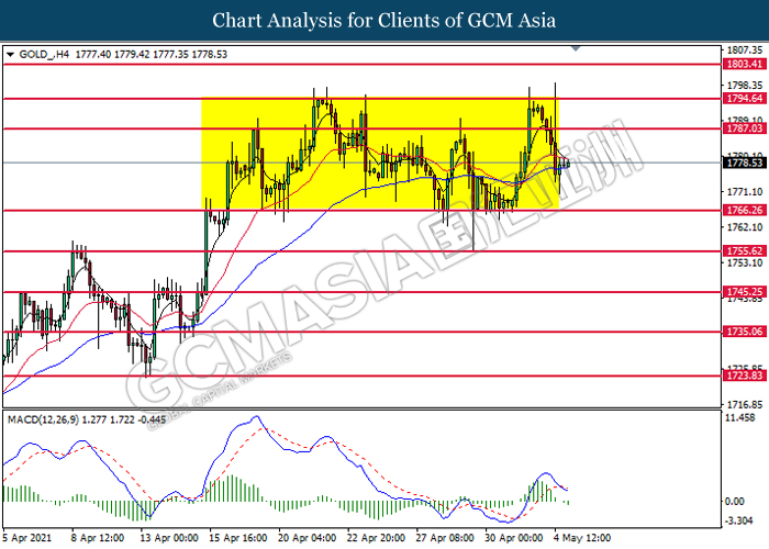 GOLD_, H4: Gold price was traded higher following prior rebound from the lower level. However, MACD which illustrated bearish bias momentum signal suggest the commodity to undergo technical correction in short term.