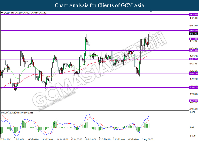 GOLD_, H4: Gold price was traded higher while currently testing near the resistance level 1456.50. MACD which display ongoing bullish momentum suggest the commodity to extend its gains after successfully breaking above the resistance level.