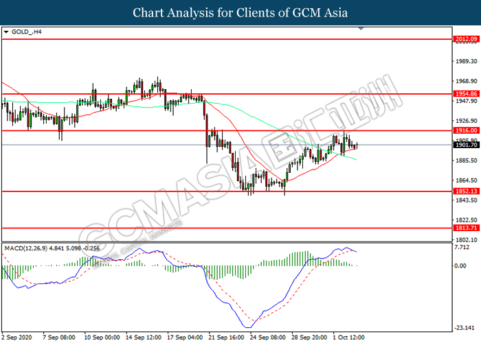 GOLD_, H4: Gold price was traded lower following prior retracement from the resistance level at 1916.00. MACD which illustrated increasing bearish momentum suggest the commodity to extend its losses toward support level at 1852.15.