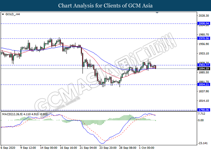 GOLD_, H4: Gold price was traded lower following prior retracement from the resistance level 1903.75. MACD which illustrate bearish bias signal with the formation of death cross suggest the commodity to extend its retracement towards the support level 1854.20.