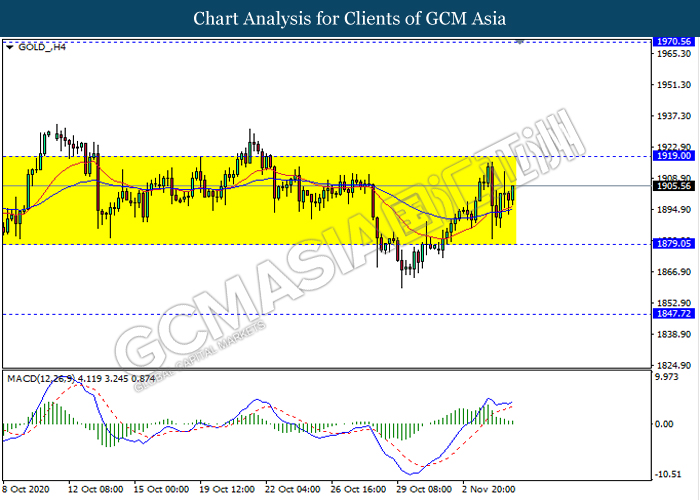 GOLD_, H4: Gold price remain traded in sideway channel. However, MACD which illustrate diminishing bullish momentum signal suggest the commodity to be traded lower in short term towards the support level 1879.05.