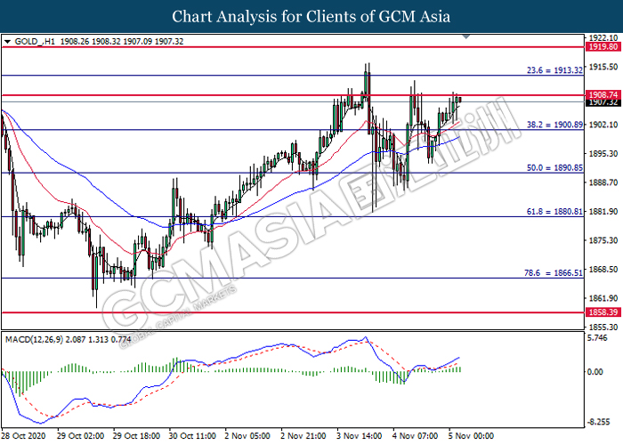 GOLD_, H1: Gold price was traded higher while currently testing the resistance level at 1908.75. MACD which illustrate bullish bias momentum suggest the commodity to extend its gains after it successfully breakout above the resistance level.