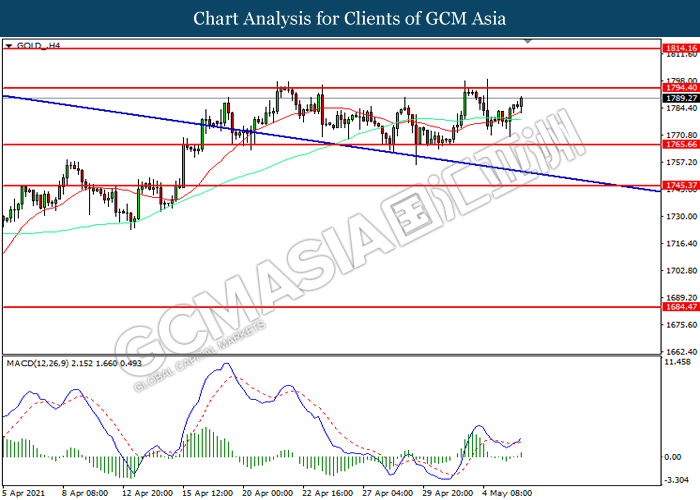 GOLD_, H4: Gold price was traded higher while currently testing the resistance level at 1794.40. MACD which illustrated increasing bullish momentum suggest the commodity to extn edits gains after it successfully breakout above the resistance level.