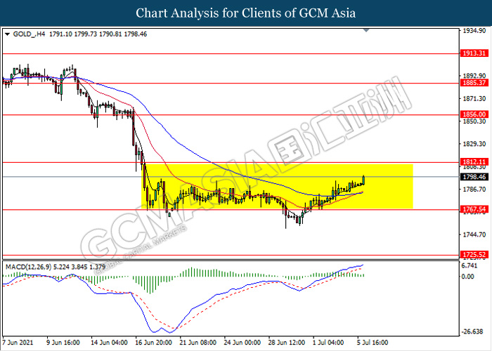 GOLD_, H4: Gold price remain traded in a sideway channel while currently testing near the resistance level 1812.10. However, MACD which illustrate bullish momentum signal suggest the commodity to be traded higher after it breaks above the resistance level.
