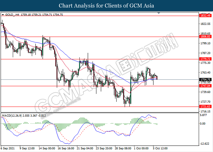 GOLD, H4: Gold price was traded lower while currently testing near the support level 1747.05. MACD which illustrate bearish momentum signal with the formation of death cross suggest the commodity to extend its losses after it breaks below the support level.