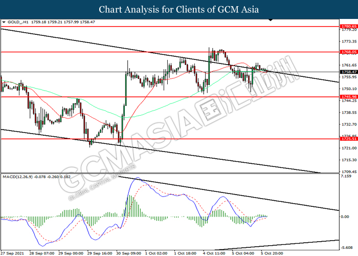 GOLD_, H1: Gold price was traded higher following prior rebound from the support level at 1746.00. However, MACD which illustrated diminishing bullish momentum suggest the commodity to be traded lower in short-term as technical correction.
