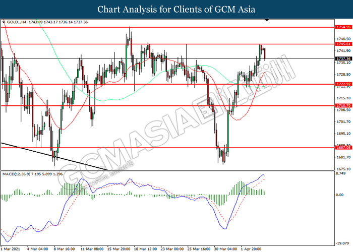 GOLD_, H4: Gold price was traded lower following prior retracement from the resistance level at 1745.60. MACD which illustrated diminishing bullish momentum suggest the commodity to extend its losses toward support level at 1722.90.