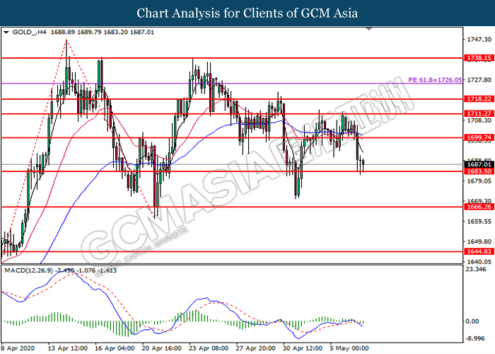 GOLD_, H4: Gold price was traded lower while currently testing the support level at 1683.50. MACD which illustrate bearish momentum signal suggest the commodity to extend its losses after it successfully breakout below the support level.