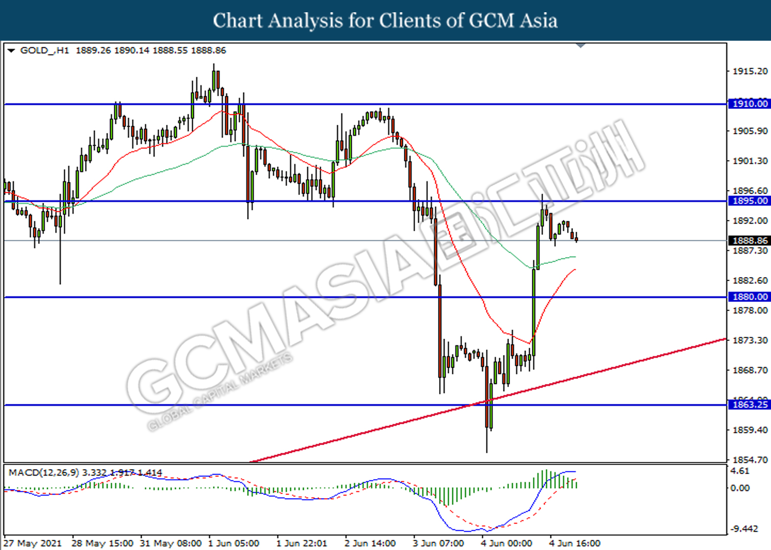 GOLD_, H1: Gold price was traded lower following a retracement from higher level. MACD which illustrate diminished bullish momentum suggest the commodity to extend its losses in short-term as technical correction