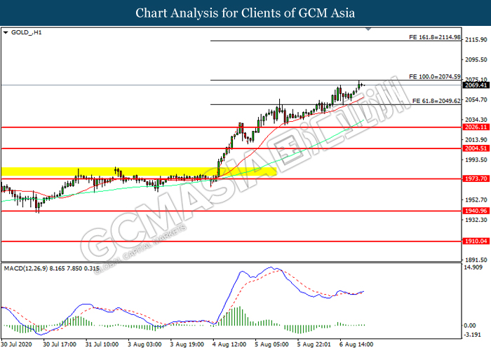 GOLD_, H1: Gold price was traded higher while currently testing the resistance level at 2074.60. However, MACD which illustrated diminishing bullish momentum suggest the commodity to be traded lower in short-term as technical correction.