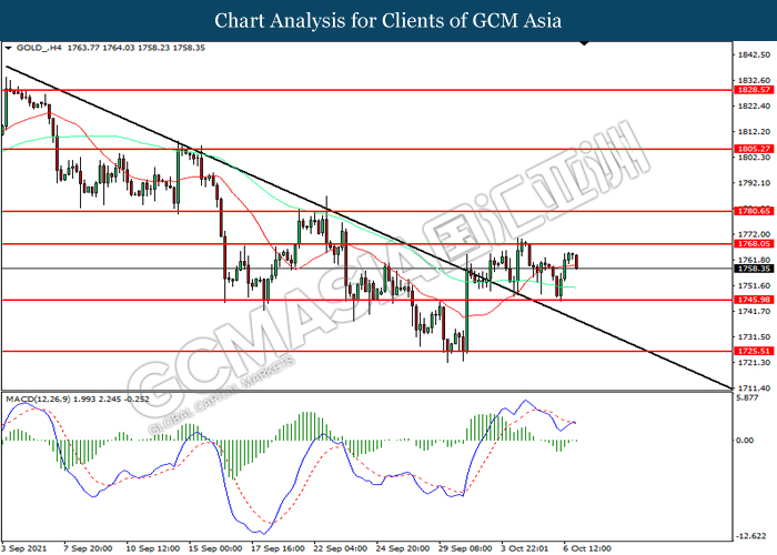 GOLD_, H4: Gold price was traded higher following prior rebound from the support level at 1746.00. However, MACD which illustrated increasing bearish momentum suggest the commodity to be traded lower in short-term as technical correction.