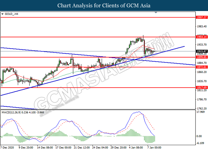 GOLD_, H4: Gold price was traded lower while currently near the support level at 1899.85. However, MACD which illustrated diminishing bearish momentum suggest the commodity to be traded lower in short-term as technical correction.