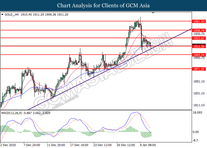 GOLD_, H4: Gold price was traded lower while currently testing the support level at 1910.00. However, MACD which illustrated diminishing bearish momentum suggest the commodity to undergo technical correction in short term toward higher level.