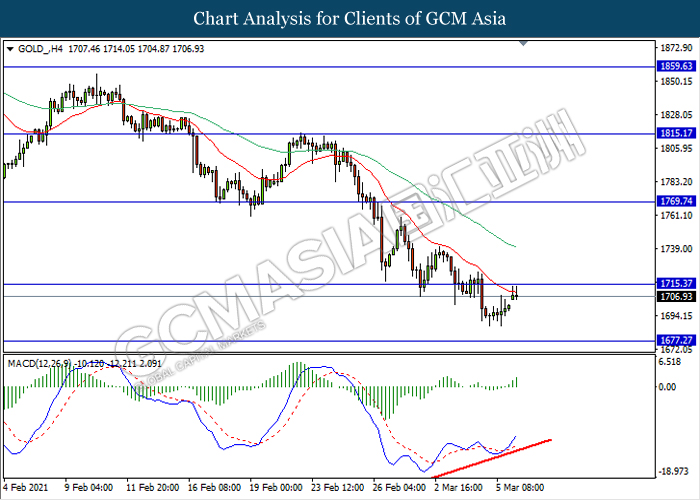 GOLD_, H4: Gold price was traded higher while currently testing near the resistance level 1715.35. MACD which illustrate bullish momentum signal with the formation of golden cross suggest the commodity to extend its gains after it breaks above the resistance level.