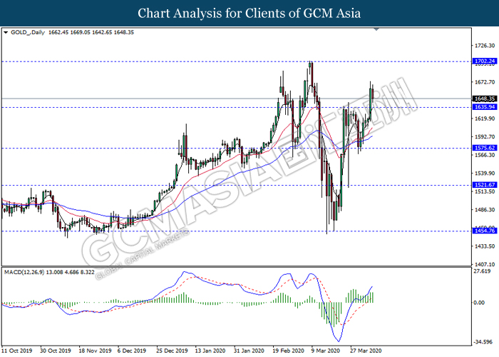 GOLD_, Daily: Gold price was traded higher following prior breakout above the previous resistance level 1635.95. MACD which illustrate persistent bullish bias signal suggest the commodity to extend its gains towards the resistance level 1702.25.