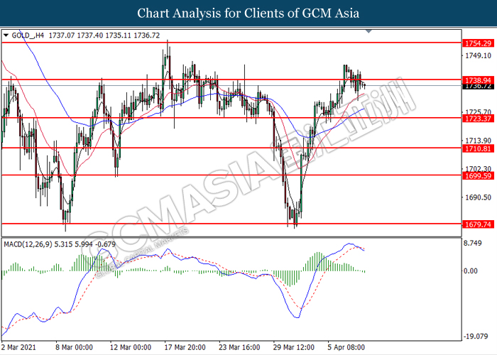 GOLD_, H4: Gold price was traded lower following prior breakout below the previous support level at 1738.95. MACD which illustrated bearish bias momentum signal suggest the commodity to extend its losses toward the support level at 1723.35.
