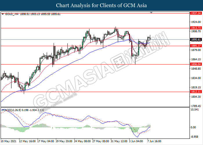 GOLD_, H4: Gold price was traded higher following recent rebound from the support level 1885.35. MACD which illustrate bullish bias signal suggest the commodity to extend its gains in short term towards the resistance level 1913.75.