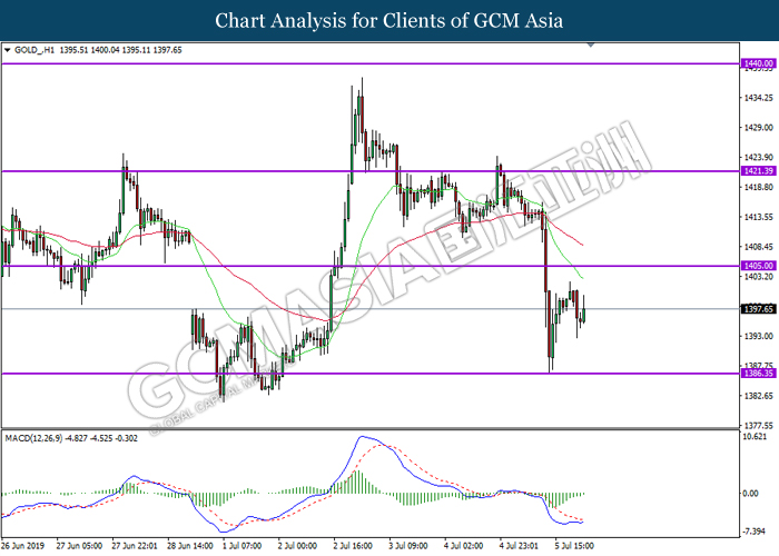 GOLD_, H1: Gold price was traded higher following prior rebound from the support level 1386.35. MACD which illustrate diminishing bearish momentum suggest the commodity to extend its rebound towards the resistance level 1405.00.