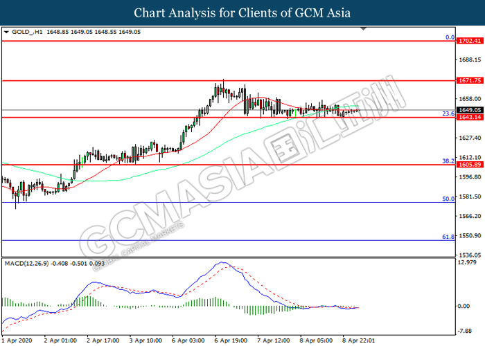 GOLD_, H1: Gold price was traded within a range while currently near the support level at 1643.15. However, due to lack of signal from MACD, it is suggested to wait for further confirmation before entering into the market.