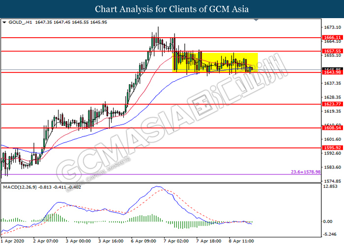 GOLD_, H1: Gold price was traded higher following prior rebound from the channel’s bottom level at 1644.00. Due to lack of signal from MACD, it is suggested to wait for further confirmation before entering into the market.