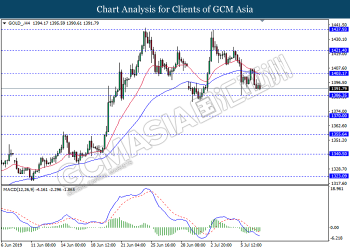GOLD_, H4: Gold price was traded lower following prior retracement from the resistance level 1403.15. However, MACD which illustrate diminishing bearish bias signal suggest the commodity to experience a technical correction in short term back towards the resistance level 1403.15.