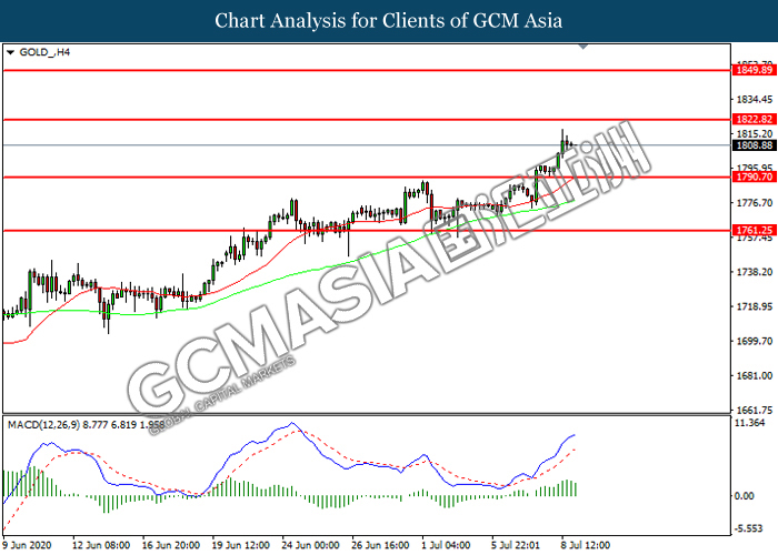 GOLD_, H4: Gold price was traded higher following prior breakout above the previous resistance level at 1790.70. However, MACD which illustrated diminishing bullish momentum suggest the commodity to be traded lower in short-term as technical correction.