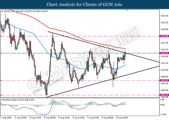 GOLD_, H1: Gold price remain traded in symmetrical triangle while currently testing the top level of the triangle and resistance level 1214.00. Although MACD which indicate ongoing bullish momentum, a breakout above the triangle and resistance level 1214.00 is required for further confirmation.