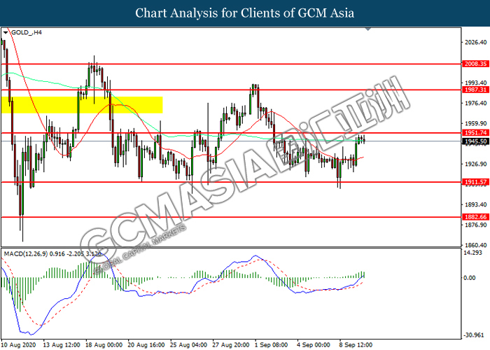 GOLD_, H4: Gold price was traded higher while currently testing the resistance level at 1951.75. However, MACD which illustrated diminishing bullish momentum suggest the commodity to be traded lower in short-term as technical correction.