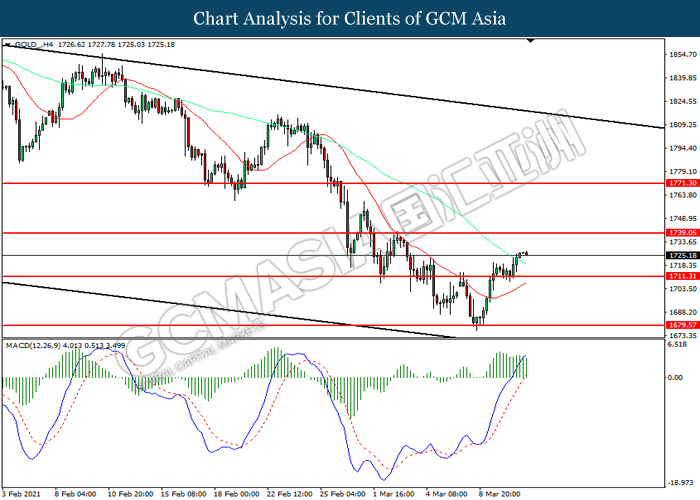 GOLD_, H4: Gold price was traded higher following prior breakout above the previous resistance level at 1711.30. However, MACD which illustrated diminishing bullish momentum suggest the commodity to be traded lower in short-term as technical correction.