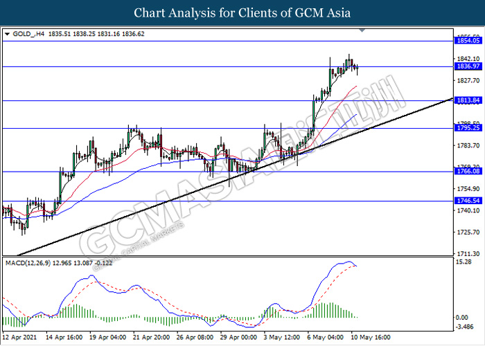 GOLD_, H4: Gold price was traded higher while currently testing the resistance level 1836.95. However, MACD which illustrate diminishing bullish momentum signal suggest the commodity experience a technical correction towards the support level 1813.85.