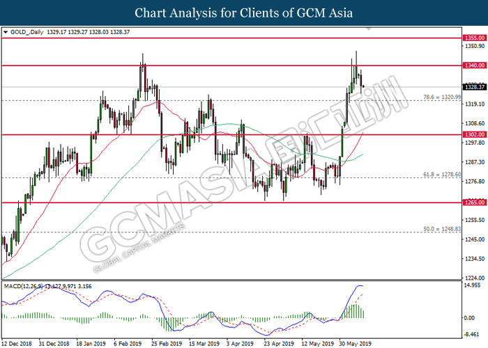 GOLD_, Daily: Gold price was traded lower following prior retracement from the resistance level near 1340.00. MACD which illustrate diminishing upward momentum suggests its prices to be traded lower in short-term as technical correction.