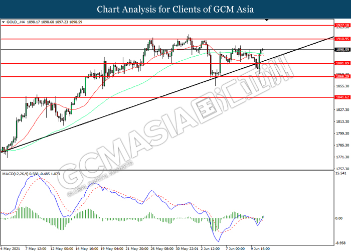 GOLD_, H4: Gold price was traded higher following prior rebound from the support level at 1881.90. MACD which illustrated increasing bullish momentum suggest the commodity to extend its gains toward resistance level at 1910.95.