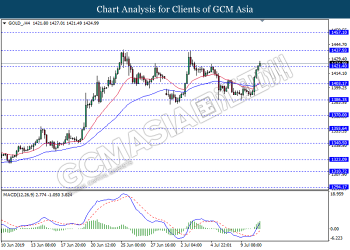 GOLD_, H4: Gold price was traded higher following prior breakout above previous resistance level 1421.40. MACD which illustrate bullish momentum with the formation of golden cross suggest the commodity to extend its gains towards the resistance level 1437.95.