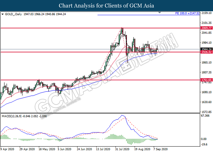 GOLD_, Daily: Gold price was traded higher following prior rebound from the support level at 1926.40. MACD which illustrated diminishing bearish momentum suggest the commodity to extend its rebound toward the resistance level at 2069.75.