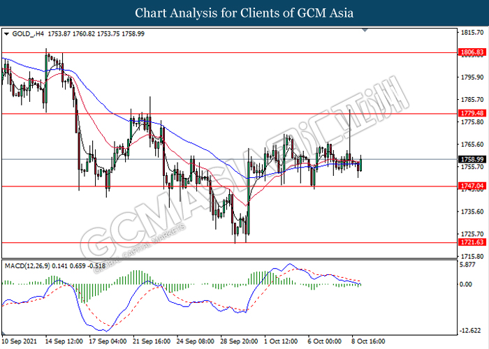 GOLD, H4: Gold price was traded flat near the support level 1747.50. However, MACD which illustrate diminishing bearish momentum signal suggest the commodity to be traded higher towards the resistance level 1779.50.