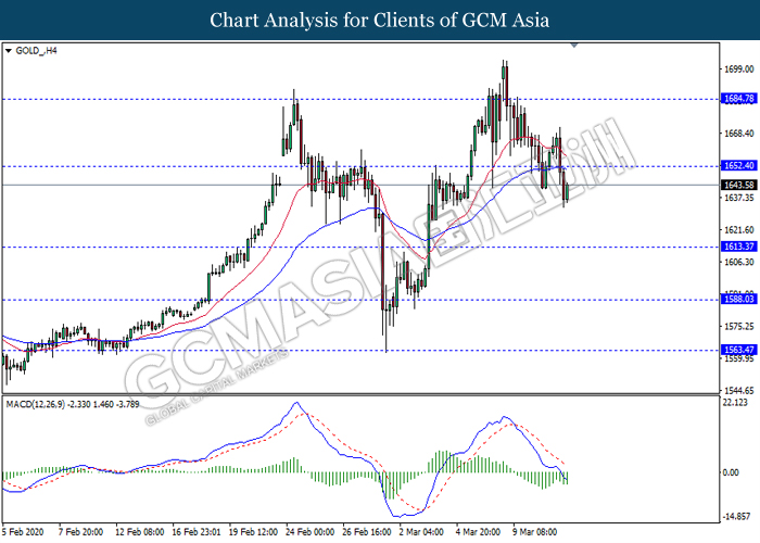 GOLD_, H4: Gold price was traded lower following prior breakout below the previous support level 1652.40. MACD which illustrate ongoing bearish momentum suggest the commodity to extend its losses towards the support level 1613.35.